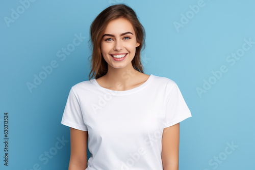 Young smiling caucasian woman wearing blank white t-shirt isolated on a blue background. AI