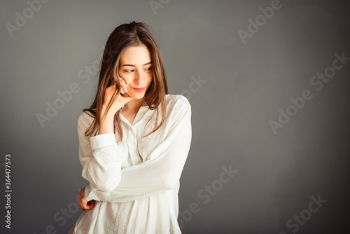 Young smiling girl in a white shirt, head tilted to the side, hand near the cheek, the second in the pocket, insulator on a gray background. No retouching. Without makeup.