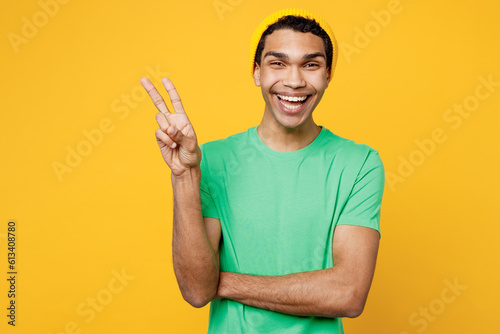 Young smiling happ fun cheerful man of African American ethnicity he wears casual clothes green t-shirt hat showing victory sign isolated on plain yellow background studio portrait. Lifestyle concept.