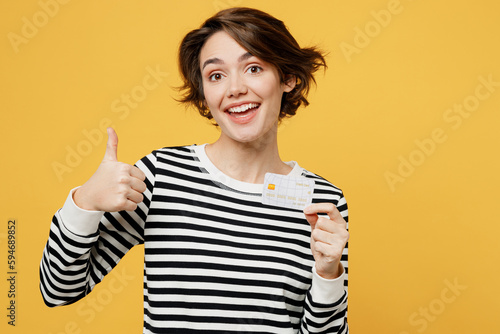 Young smiling happy fun cheerful rich woman wear casual striped black and white shirt hold in hand mock up of credit bank card show thumb up isolated on plain yellow color background studio portrait.