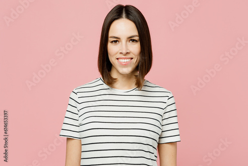 Young smiling happy satisfied fun cheerful caucasian woman she wears casual clothes t-shirt looking camera isolated on plain pastel light pink color wall background studio portrait. Lifestyle concept.