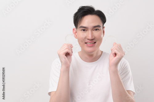 Young smiling man holding invisalign braces over white background studio, dental healthcare and Orthodontic concept...