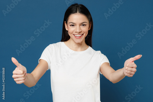Young smiling pretty happy cute cheerful satisfied positive attractive beautiful latin woman 20s in white casual basic t-shirt show thumbs up gesture isolated on dark blue background studio portrait.