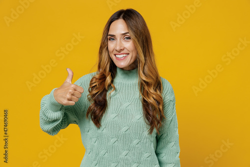 Young smiling satisfied happy fun caucasian woman 30s wearing green knitted sweater showing thumb up like gesture isolated on plain yellow color background studio portrait. People lifestyle concept.