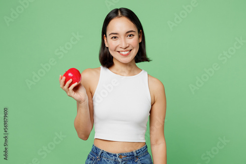 Young smiling vegetarian woman wear white clothe s hold in hand ripe red apple look camera isolated on plain pastel light green background. Proper nutrition healthy fast food unhealthy choice concept.