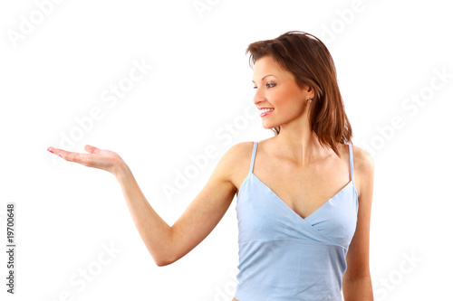 Young smiling woman with hand gesture and copy space
