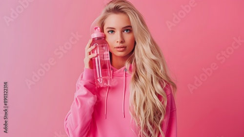Young sport blonde woman over isolated pink background with sports water bottle.