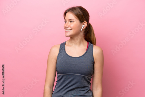 Young sport caucasian woman isolated on pink background looking side