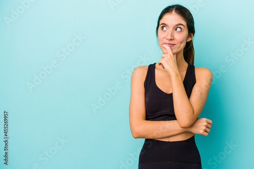 Young sporty caucasian woman isolated on blue background relaxed thinking about something looking at a copy space.