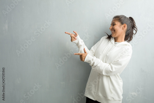Young sporty indian woman against a gym wall pointing to the side, smiling surprised presenting something, natural and casual