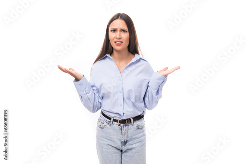 young stylish caucasian model woman with makeup and with dark straight hair dressed in a blue blouse on a white background with copy space
