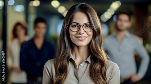 Young Successful and good-looking Woman Team Leader Start-up CEO Lawyer Boss in an office with Staff Generative AI Digital Art Background Illustration