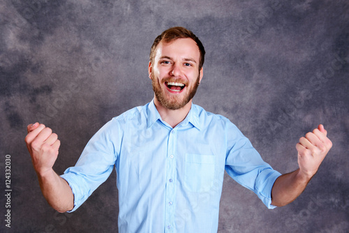 young successful bearded man showing fist