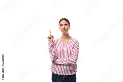 young successful brunette business woman dressed in a striped shirt holding thumbs up