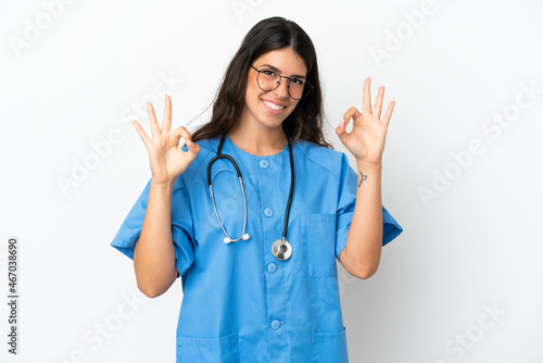 Young surgeon doctor caucasian woman isolated on white background showing an ok sign with fingers