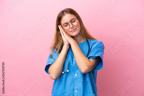 Young surgeon doctor woman isolated on pink background making sleep gesture in dorable expression
