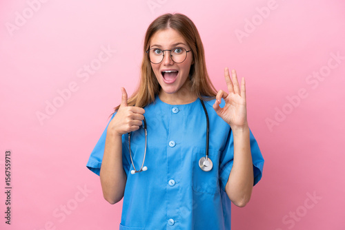 Young surgeon doctor woman isolated on pink background showing ok sign and thumb up gesture