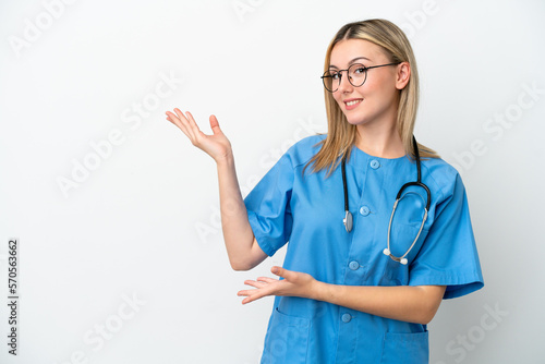 Young surgeon doctor woman isolated on white background extending hands to the side for inviting to come