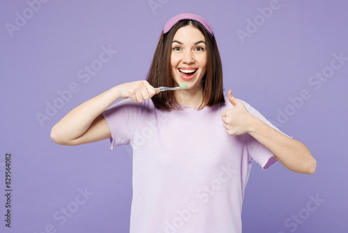 Young surprised happy calm woman wear pyjamas jam sleep eye mask rest relax at home brush teeth show thumb up isolated on plain pastel purple background studio portrait. Good mood night nap concept.