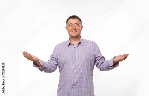 Young surprised man portrait of a confident businessman showing by hands on a gray background. Ideal for banners, registration forms, presentation, landings, presenting concept.