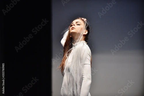 Young teenage girl in white jersey perform modern dance