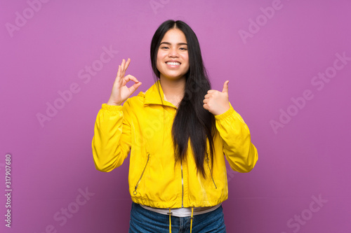 Young teenager Asian girl over isolated purple background showing ok sign and thumb up gesture