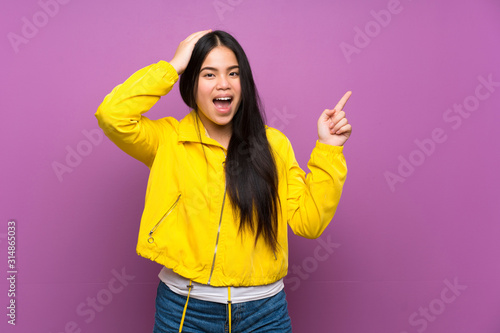 Young teenager Asian girl over isolated purple background surprised and pointing finger to the side