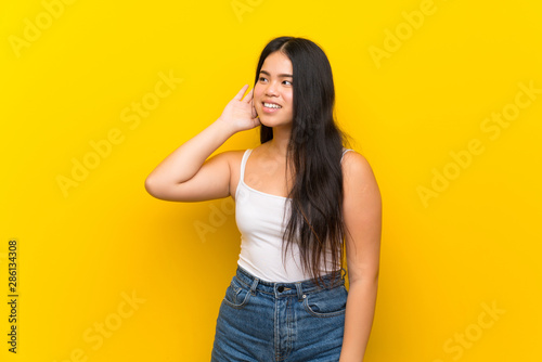 Young teenager Asian girl over isolated yellow background listening to something by putting hand on the ear