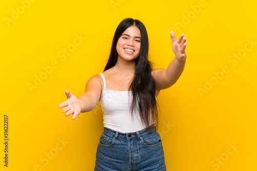 Young teenager Asian girl over isolated yellow background presenting and inviting to come with hand