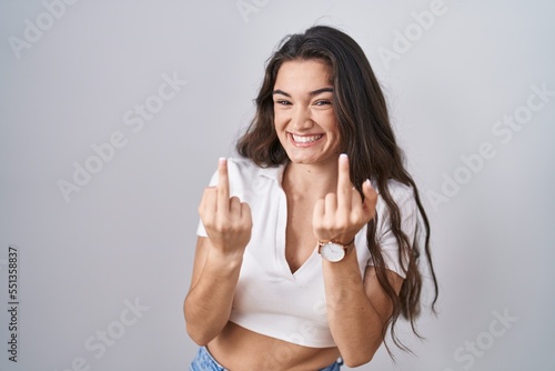 Young teenager girl standing over white background showing middle finger doing fuck you bad expression, provocation and rude attitude. screaming excited