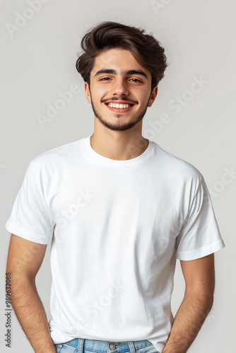 Young Turkish man smiling in white t-shirt on white background. Studio photography. Mockup Template