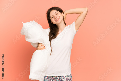 Young Ukrainian girl isolated on pink background in pajamas and holding a pillow and yawning