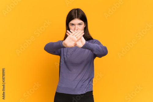 Young Ukrainian girl isolated on yellow background making stop gesture with her hand to stop an act