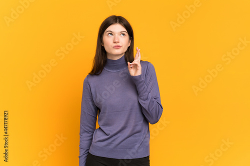Young Ukrainian girl isolated on yellow background with fingers crossing and wishing the best