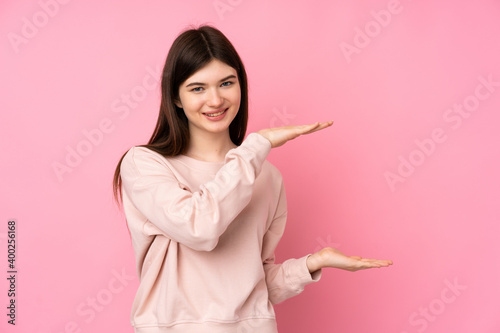 Young Ukrainian teenager girl over isolated pink background holding copyspace to insert an ad