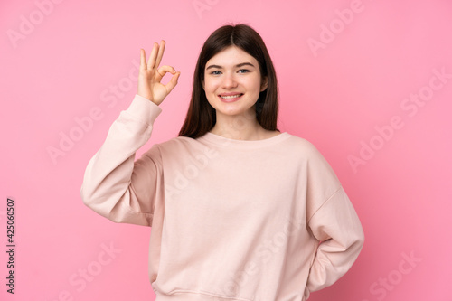 Young Ukrainian teenager girl over isolated pink background surprised and showing ok sign
