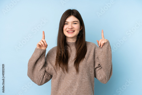 Young Ukrainian teenager girl wearing a sweater over isolated blue background pointing up a great idea
