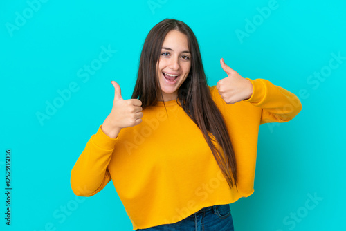 Young Ukrainian woman isolated on blue background giving a thumbs up gesture