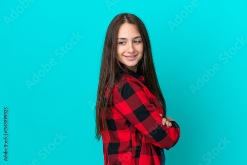 Young Ukrainian woman isolated on blue background looking to the side and smiling
