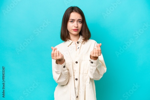 Young Ukrainian woman isolated on blue background making money gesture but is ruined