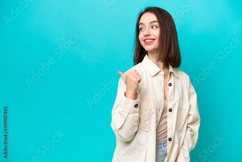 Young Ukrainian woman isolated on blue background pointing to the side to present a product