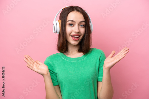 Young Ukrainian woman isolated on pink background surprised and listening music