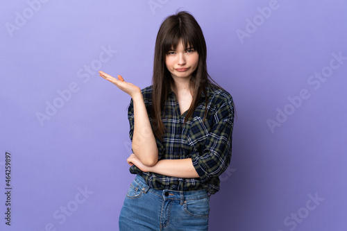 Young Ukrainian woman isolated on purple background having doubts