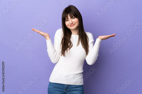 Young Ukrainian woman isolated on purple background making doubts gesture