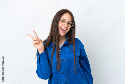 Young Ukrainian woman isolated on white background smiling and showing victory sign