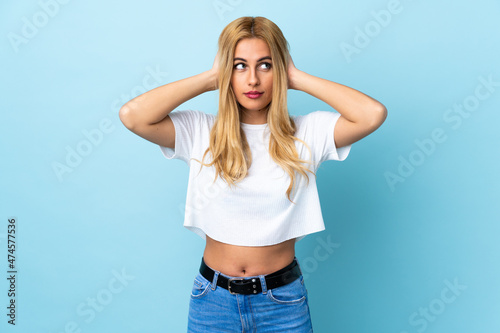 Young Uruguayan blonde woman over isolated blue background frustrated and covering ears