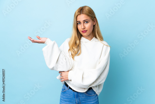 Young Uruguayan blonde woman over isolated blue background having doubts