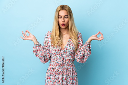 Young Uruguayan blonde woman over isolated blue background in zen pose