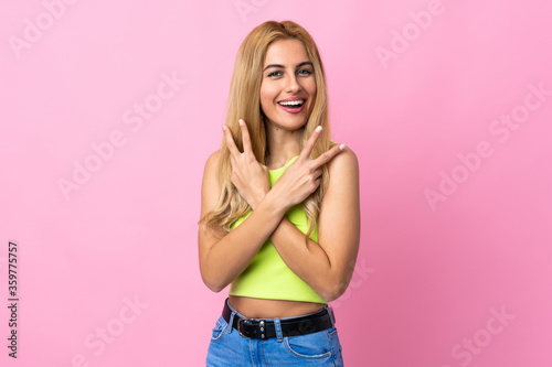 Young Uruguayan blonde woman over isolated pink background smiling and showing victory sign