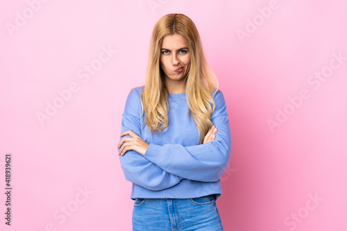 Young Uruguayan blonde woman over isolated pink background with unhappy expression